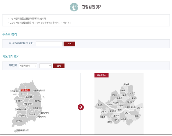 네이버나 구글에서 <관할법원찾기>로 검색을 하면 다음과 같은 화면을 보실 수가 있습니다. 관할법원은 ‘주소’ 또는 ‘지도’ 검색을 통해서 쉽게 찾을 수가 있습니다.